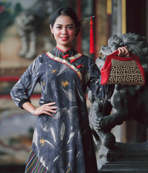 Ada busana Chiongsam dari bahan-bahan tradisional paduan tenun, lurik dan batik. Ada pula sarung pewarna alam, dan beragam aksesoris pelengkapnya.